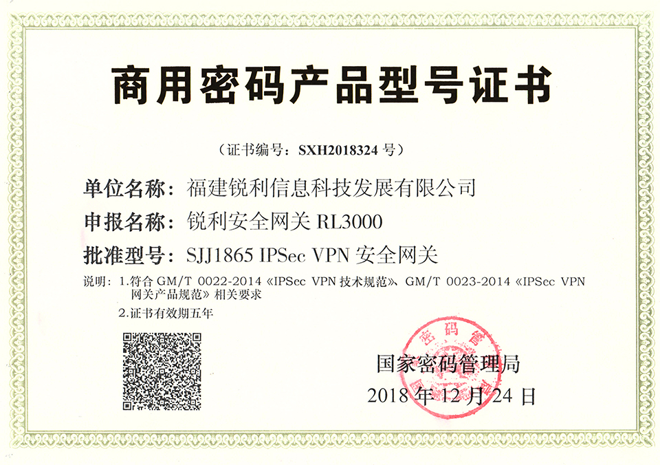 近日,锐利科技“IPSec VPN安全网关”通过了国家密码管理局的商用密码组织产品检测及专家鉴定,获得了由该局颁发的《商用密码产品型号证书》,是目前福建省唯一获得安全网关商用密码产品型号证书的企业。